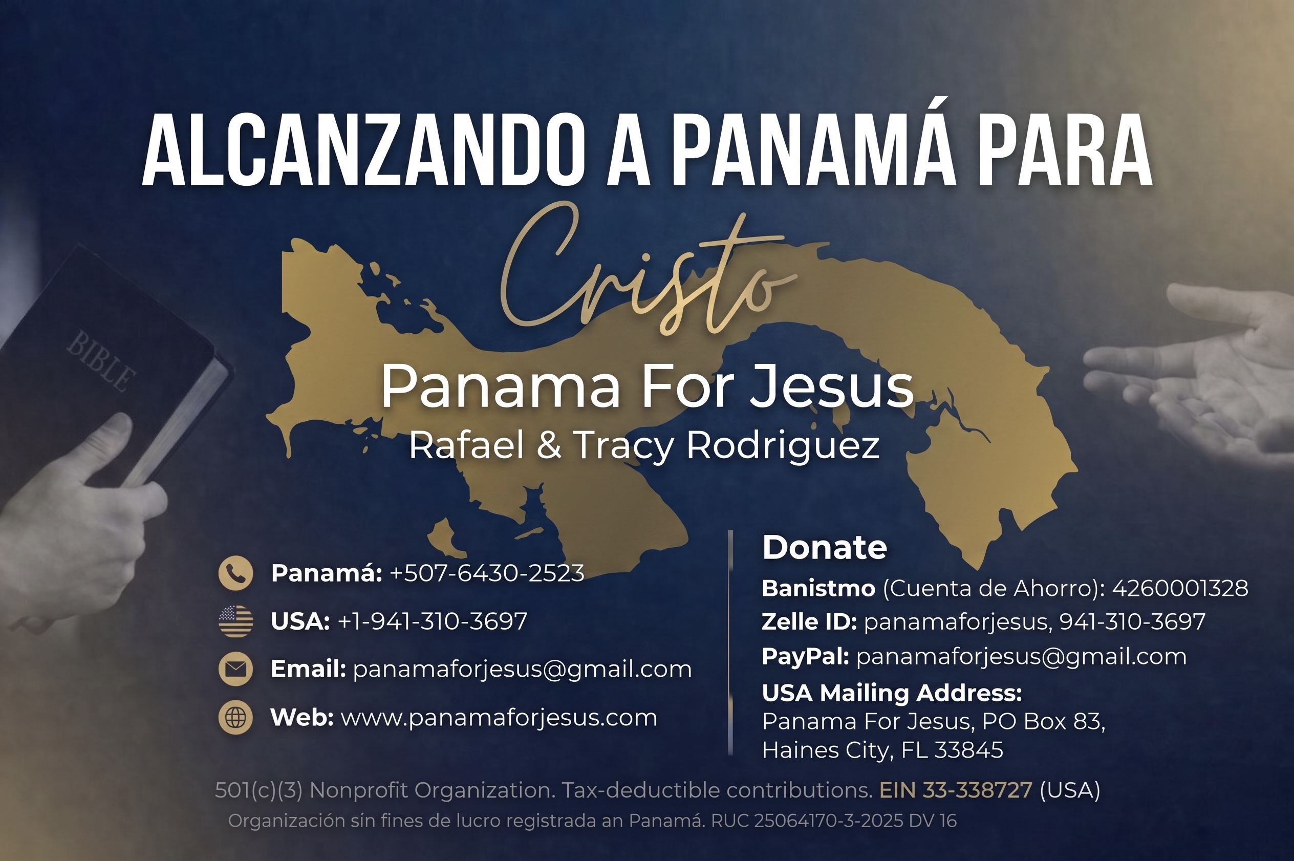 Panama for Jesus Incorporated is dedicated to empowering pastors, missionaries, and local churches to make a meaningful difference in their communities. By providing comprehensive financial and spiritual support, we strive to help them reach more souls for Christ and build a stronger, more connected faith community in Panama. We invite individuals and organizations to join us in this mission, as together, we can bring about lasting change.